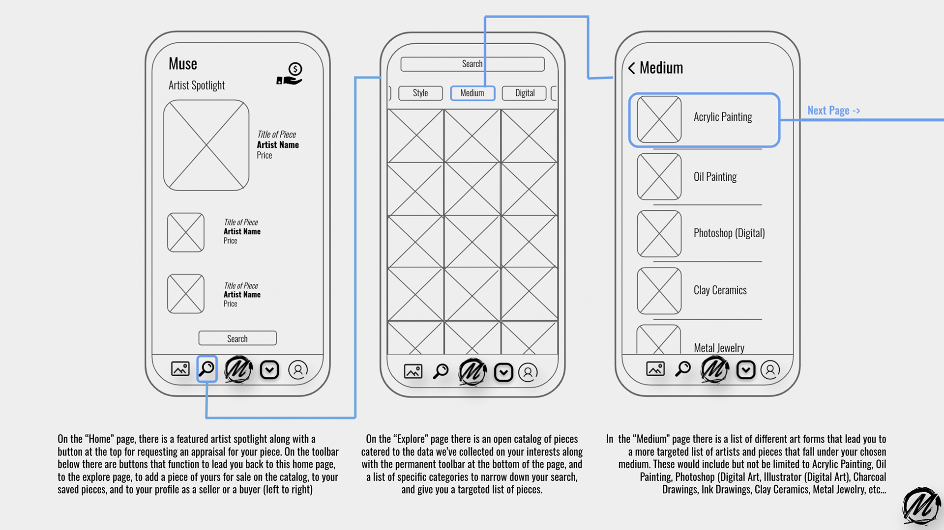 MUSE is a conceptual project that is meant to track artwork through an application so that artists would see a kickback percentage of any future revenue their artwork generated after initial sale.